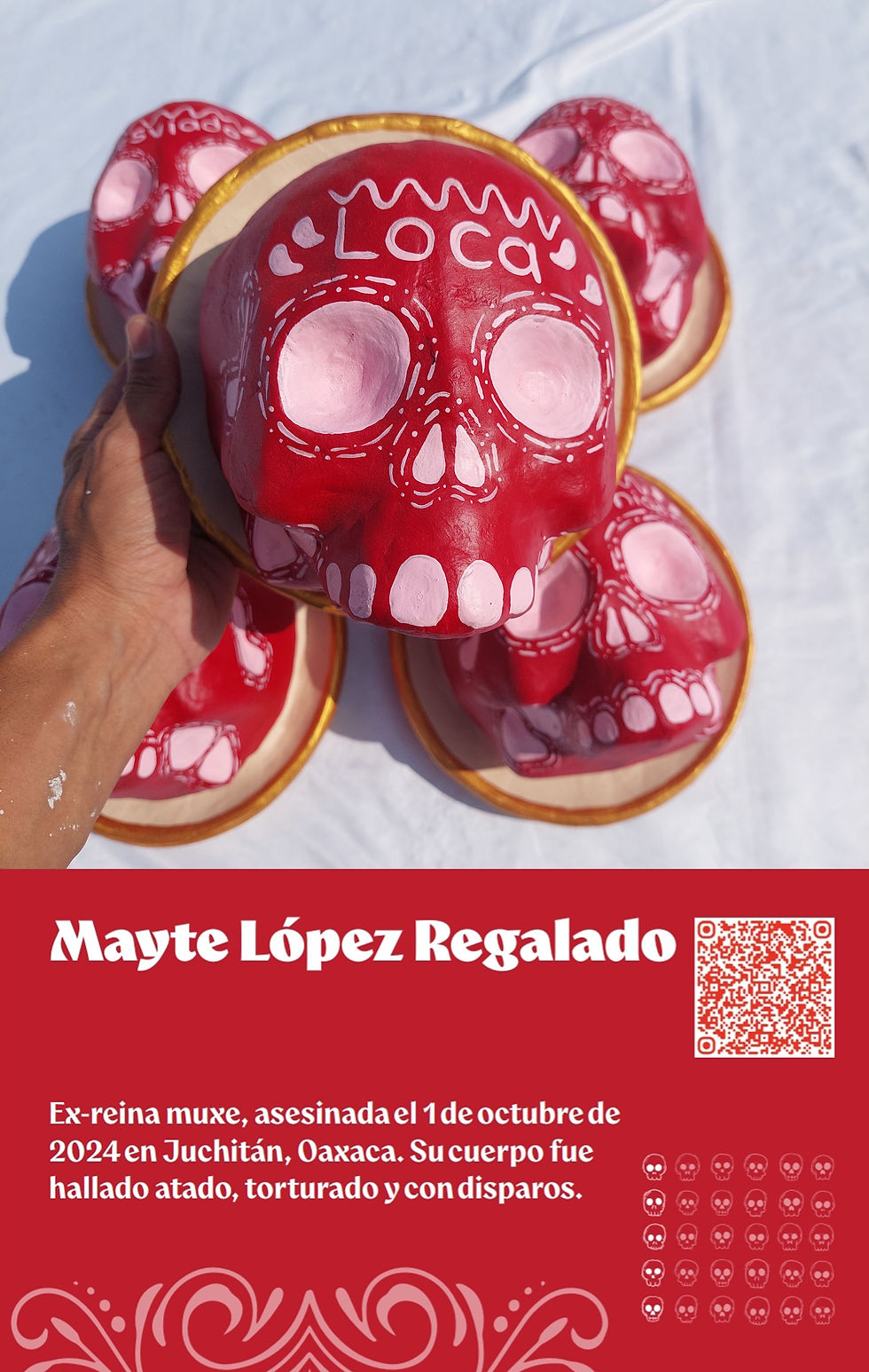 En “Tzompantli a la comunidad LGBTQ+”, esta antigua práctica se reinterpreta para la memoria contemporánea. La obra está formada por 30 cráneos de cartonería pintados con los colores de la bandera arcoíris, cada uno acompañado de una ficha con el nombre de una persona LGBTQ+ víctima de un crimen de odio, un breve resumen de la noticia y un código QR que permite acceder a la información original.